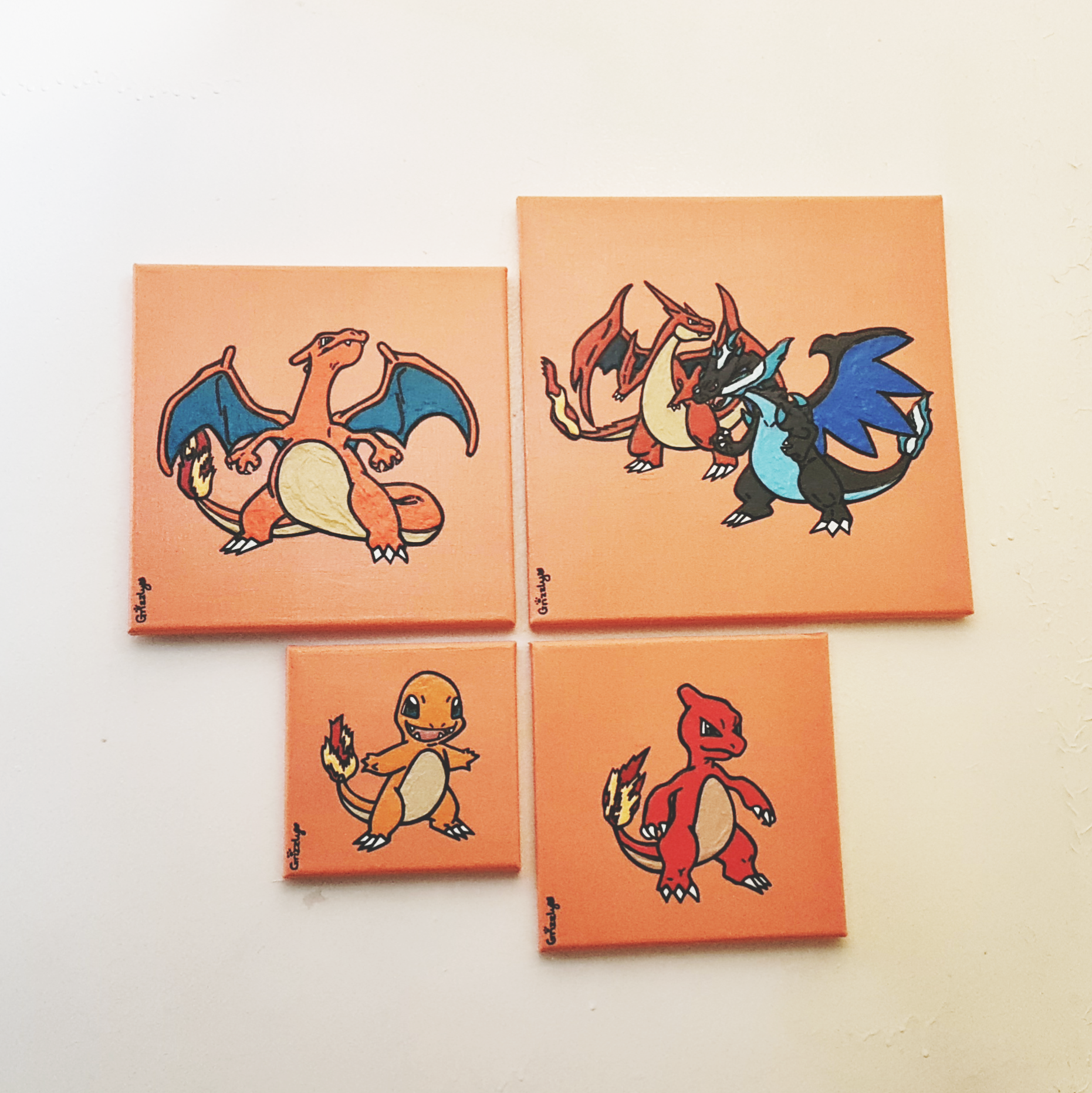 HANDPAINTED CHARMANDER EVOLUTION BUNDLE! CHARMANDER, CHARMELEON, CHARIZARD, MEGA CHARIZARD X AND Y! Fire Pok'emon Bundle! 4 Canvases! Which starter Pok'emon will you choose?